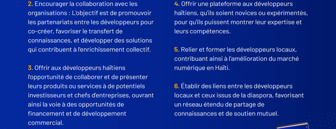 Offrir aux développeurs haïtiens l'opportunité de collaborer et de présenter leurs produits ou services à de potentiels investisseurs et chefs d'entreprises, ouvrant ainsi la voie à des opportunités de financement et de développement commercial.